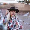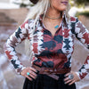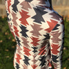 The new Ashley Cut features a main print and a flattering inset design creating a unique and eye catching look! The Great Plains design utilizes a tribal print, shaded with a charcoal, taupe, and a rusty-brown aztec repeat on a bone background. The middle inset piece features a distressed buffalo print in black and rusty-brown. You can also contact us for other customization options!