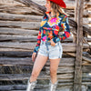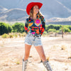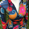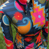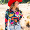One of my new favorites! This fun & moody modern abstract western print really POPS with colors of burnt orange, pink, mustard, lots of light blue and olive on a navy background. Aztec and cactus floral design. Contact me for customization options!