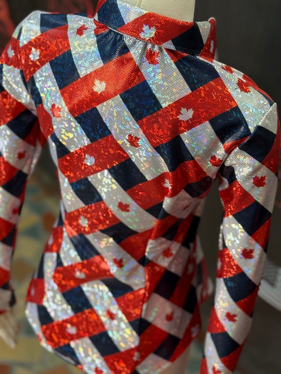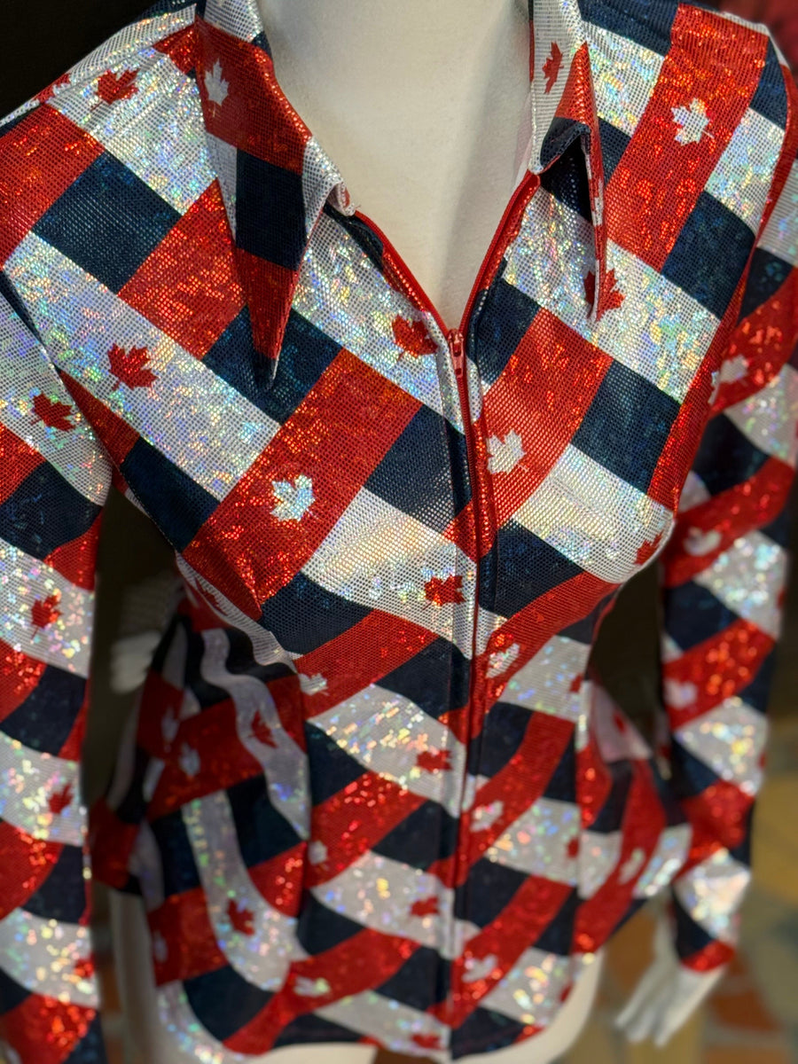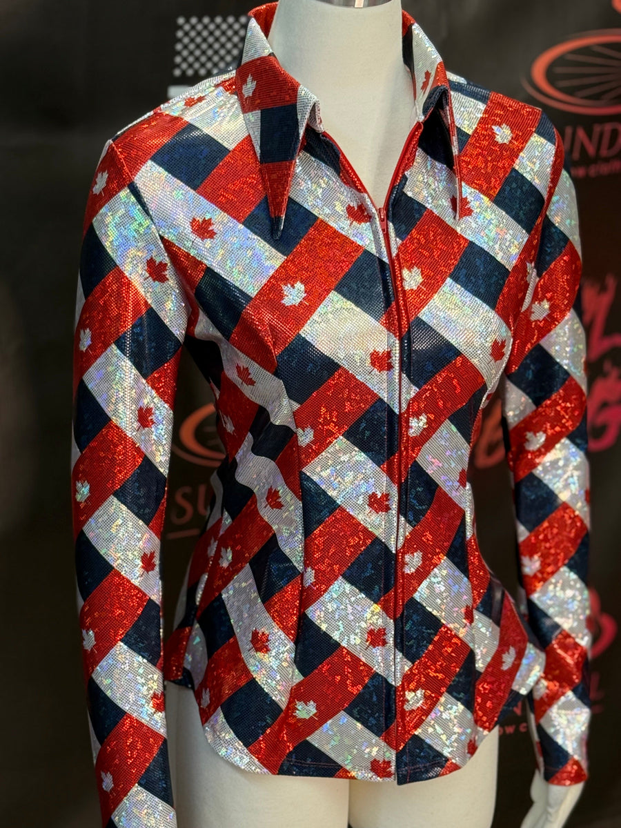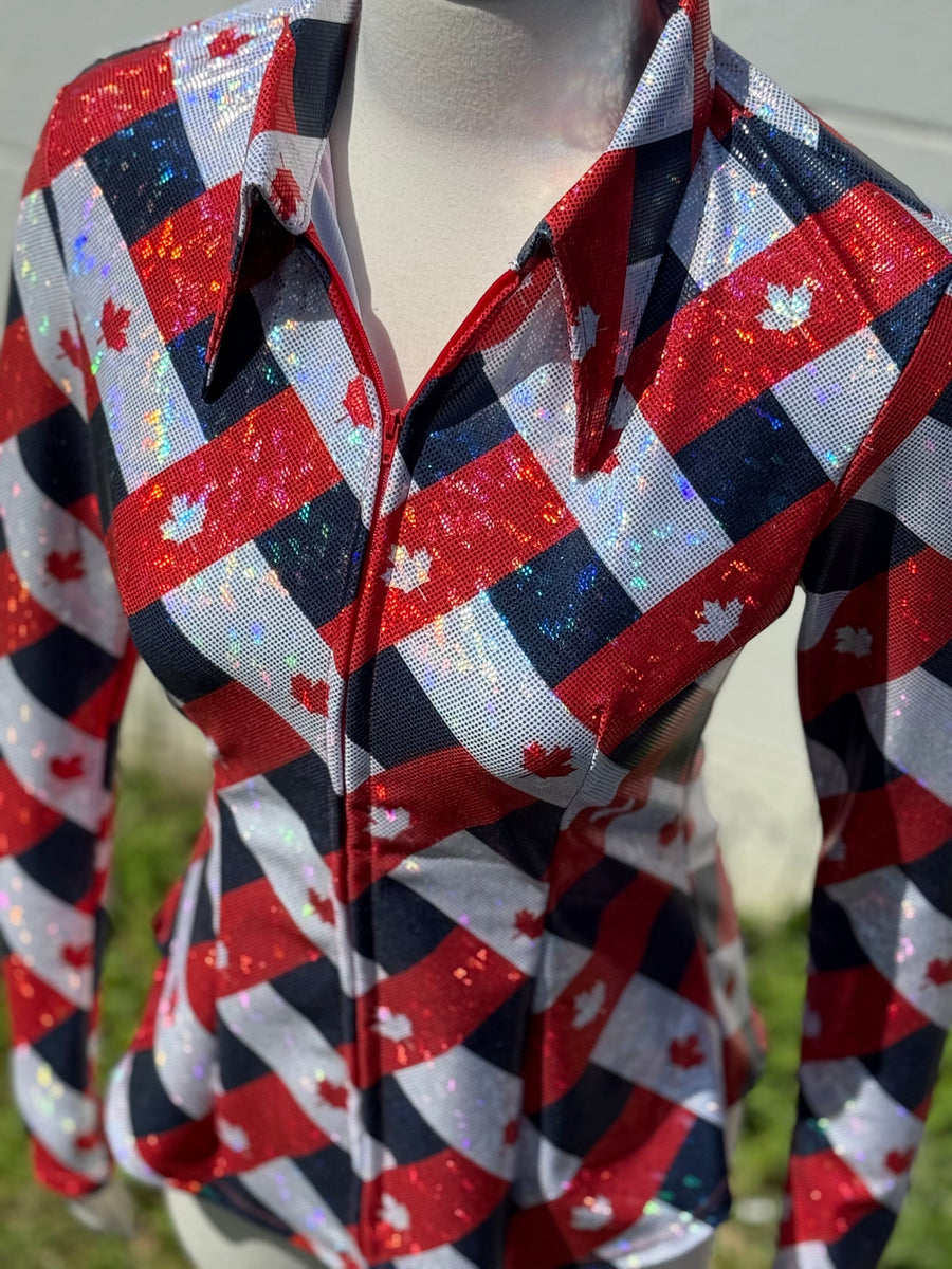 Raise a little dust and a whole lotta pride in the True North performance shirt by Sundial Show Clothing. Built for the bold and styled for the spotlight, this rodeo-ready stunner is decked out in rich Canadian red, classic black, and clean white—highlighted with mirror-bright prism shine and proud maple leaf detailing. Whether you’re flying around barrels or walking the grand entry, this shirt catches every glint of light and every eye in the stands. It's a salute to the True North with the heart of a champion. Saddle up and show ’em what Canada’s made of. Pictured here with our Classic collar!