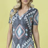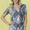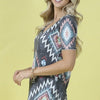Absolutely adorable print on this perfectly western v-neck! Charcoal grey base with hints of colorful aztec featuring turquoise, pink, lime and coral. Flowy, lightweight fabric and true to size. Made in the USA and limited quantity so get yours before your size sells out...
