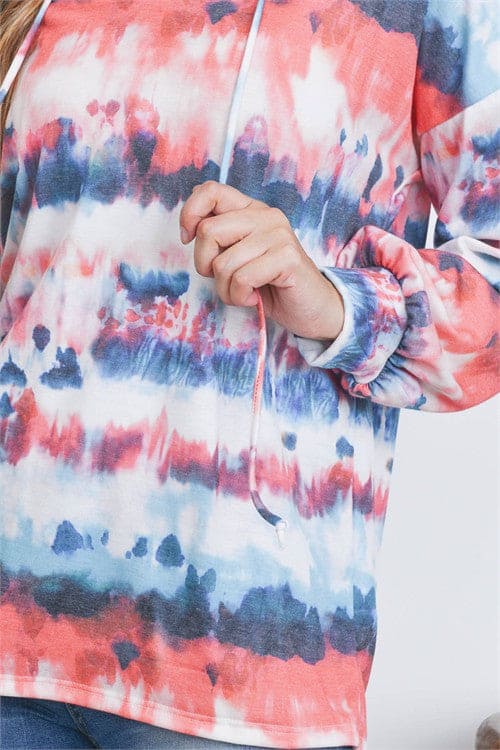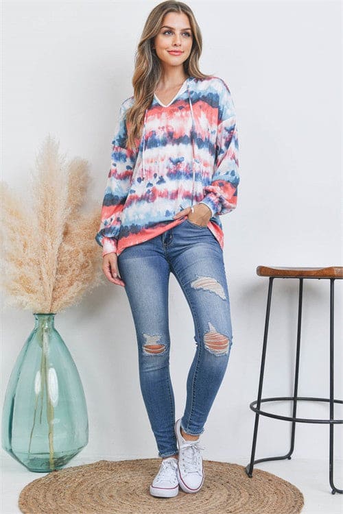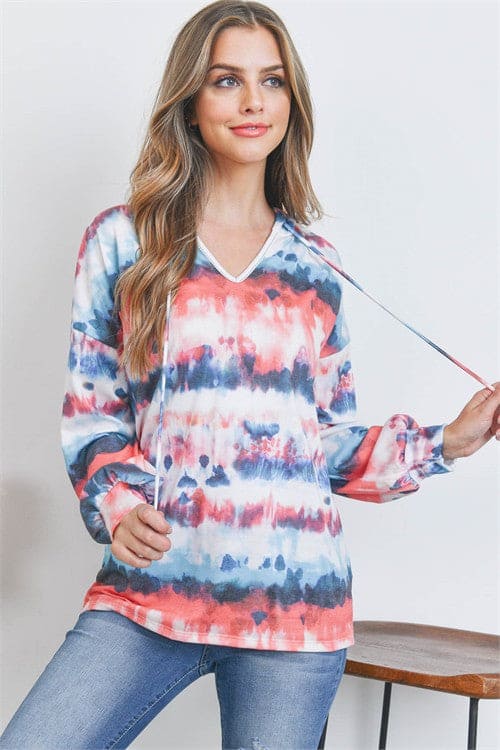 Slouchy soft tie-dye hoodie, featuring a V cutout at the neck, with hood and drawstrings! True-to size (not oversized). You may want to size up in this style.