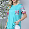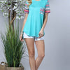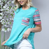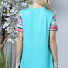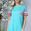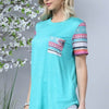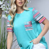 This flowy, lightweight fabric is a bright turquoise color with a cute serape accent on the sleeves and accent front pocket. This style runs loose fitting and long. Made in the USA and limited quantity so get yours before your size sells out...