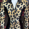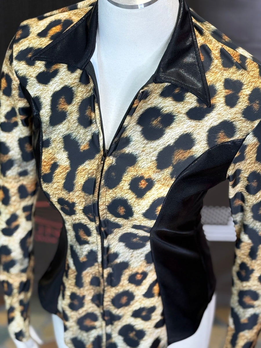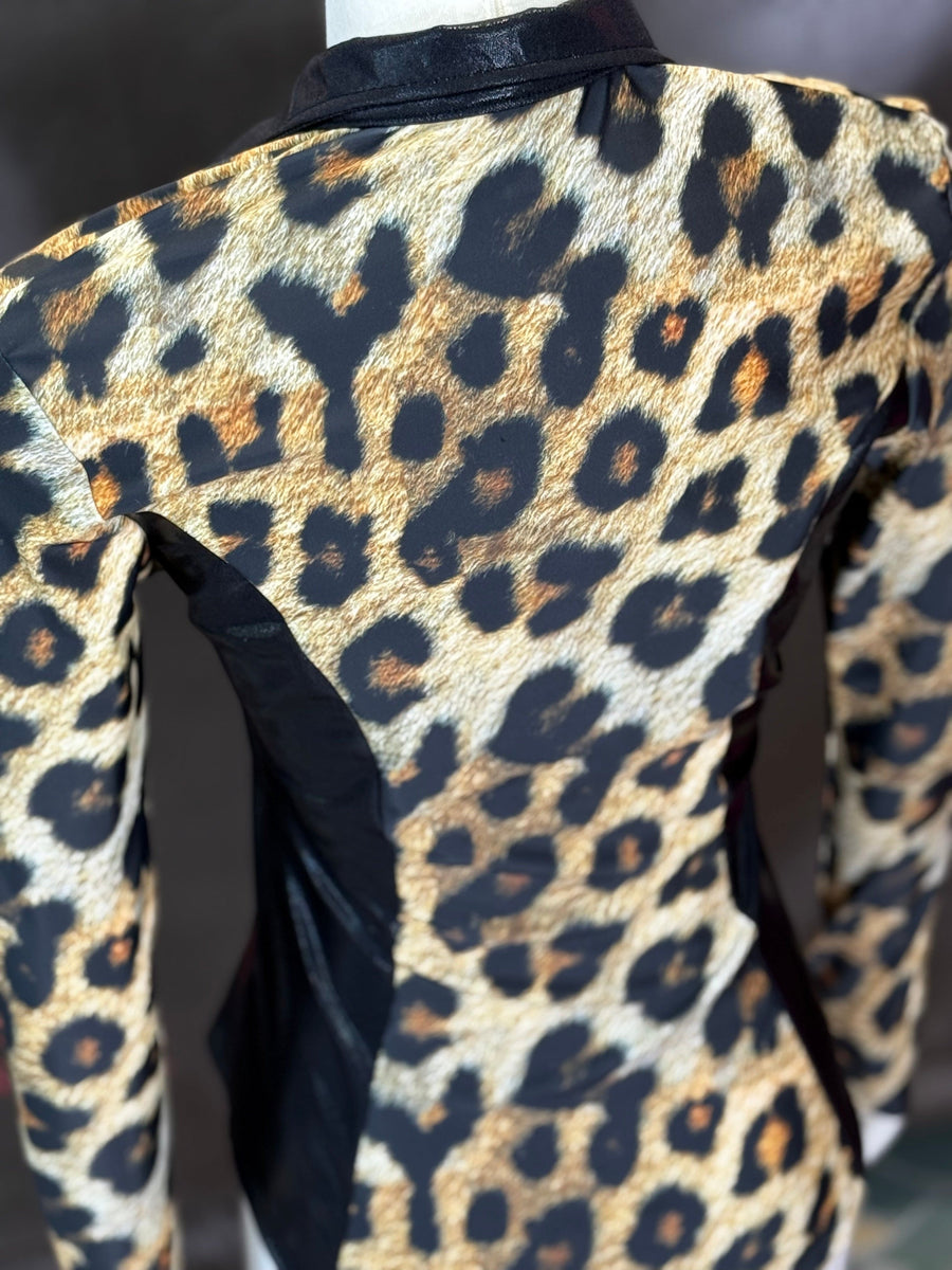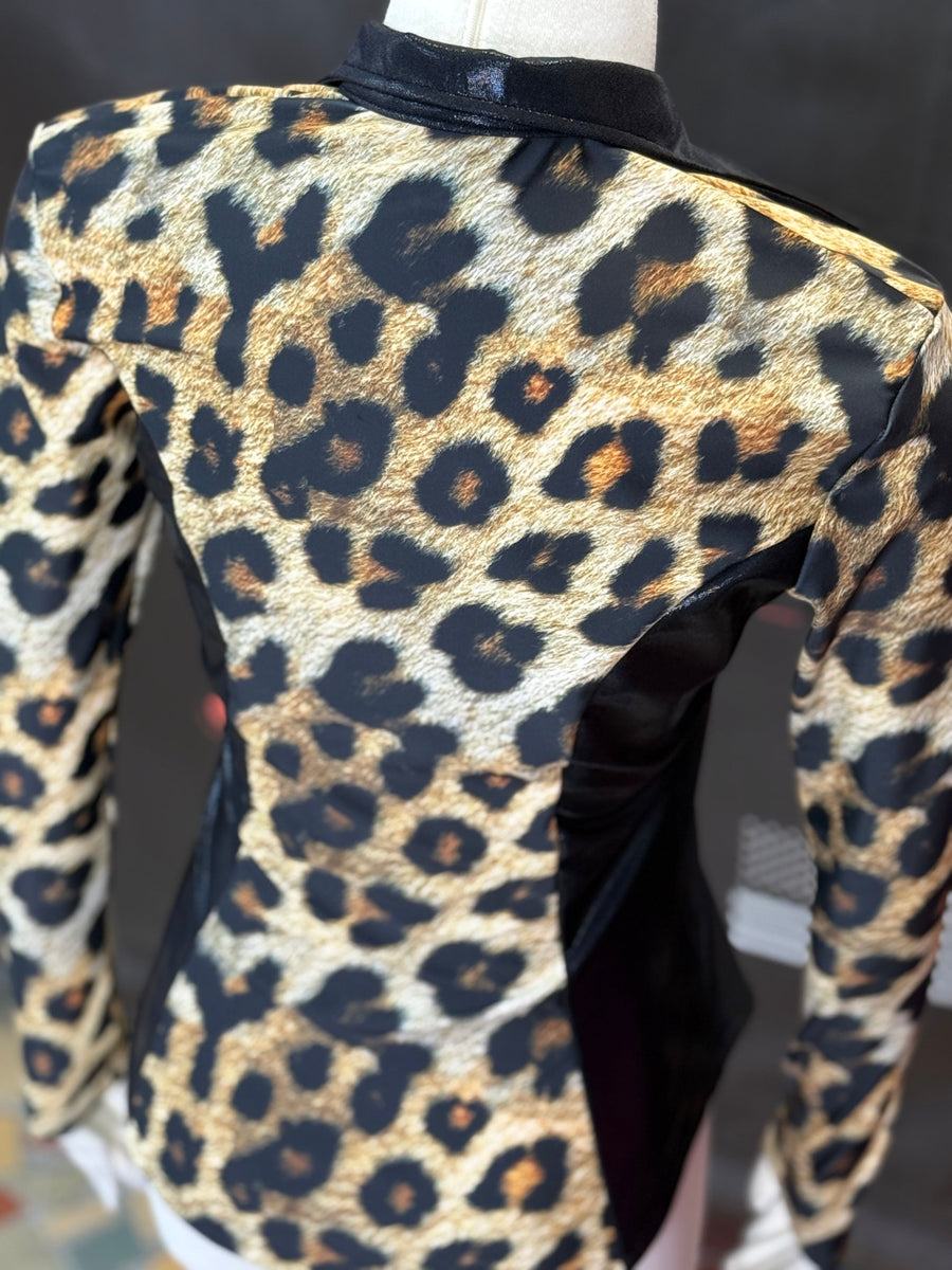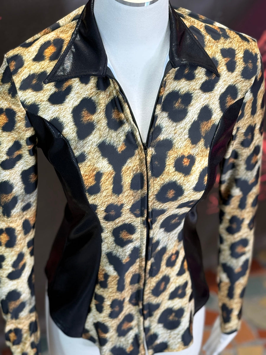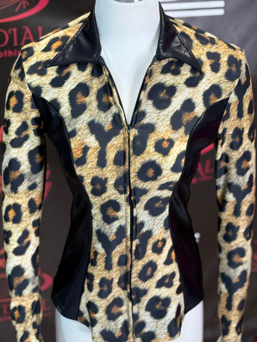 ”Friend or Faux” is a super detailed leopard print in the perfect scale for any equestrian endeavor. A go-to in any rodeo closet! We've accented this in stock shirt in our popular Dolly cut design with sleek black wet-look accents. In stock in size XS with the relaxed collar.
