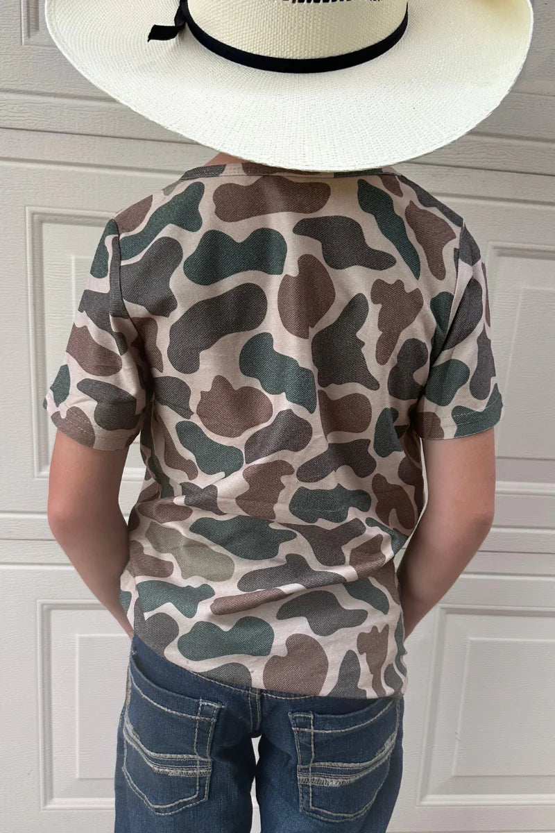 This brown, green and tan camo tee is built for your little explorer. With a classis crew neck and a cool, outdoorsy print, its perfect for the backyard adventures, ranch days, or just blending in (while standing out). Comfy, durable, and full of that wild-at-heart energy- this tee is ready for wherever their boots take em.