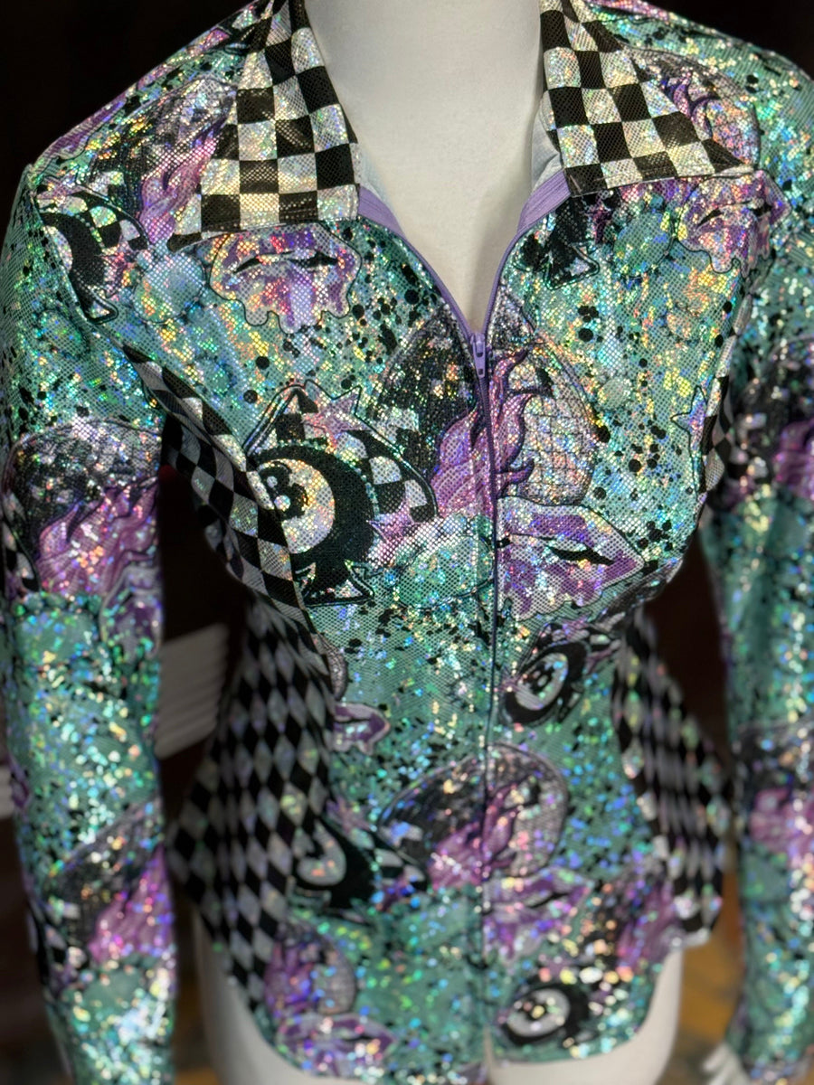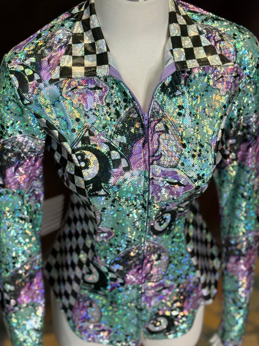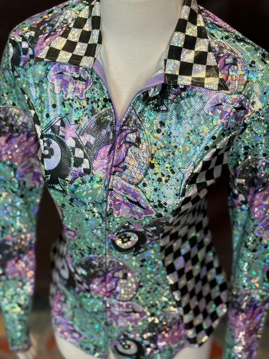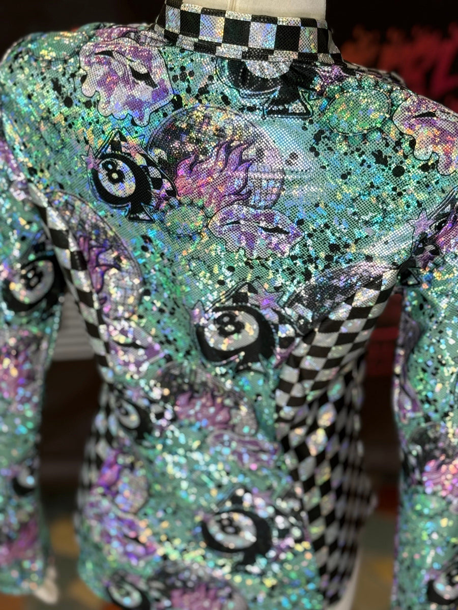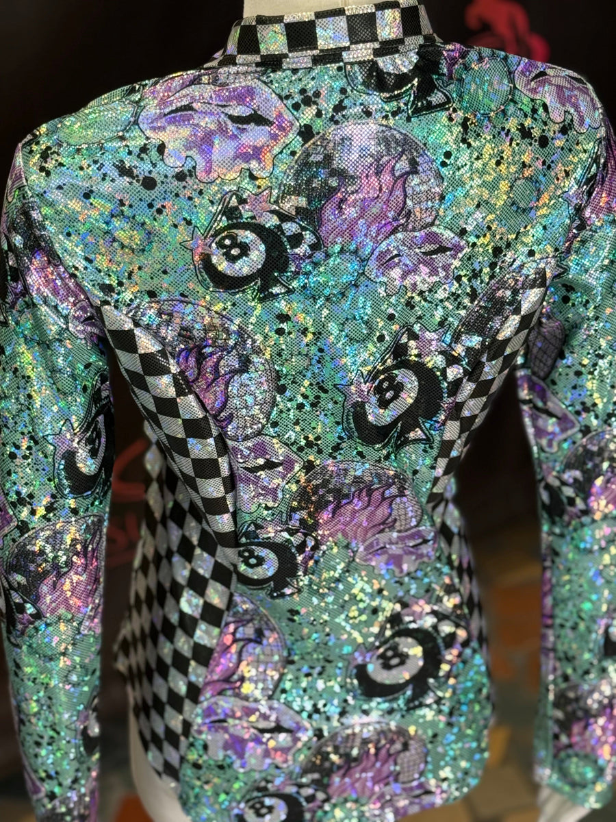 This playful checkered Dolly cut features a fun 8-ball design with purple and aqua accents, and checkered aces. In stock in size Medium with our relaxed collar!