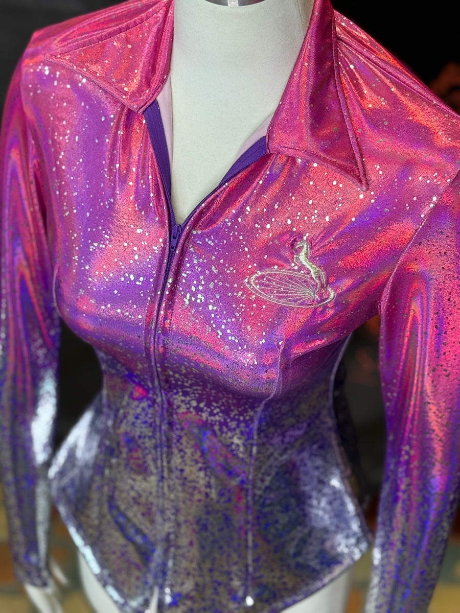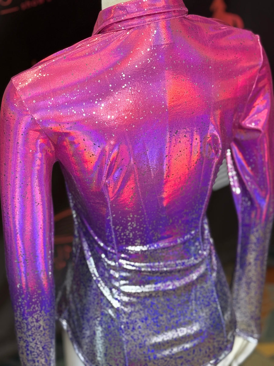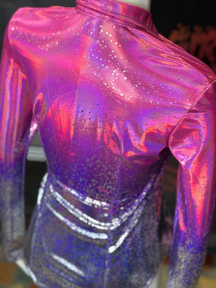 This unique pink and purple holographic ombre style features a mirror foil that reflects light and color! The silver mirrored splatter accent is placed at the bottom half of the design. In stock and ready to ship with our relaxed collar in size M! Made from 4-way stretch lycra which is comfortable and lightweight.