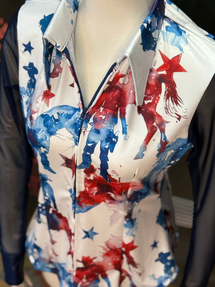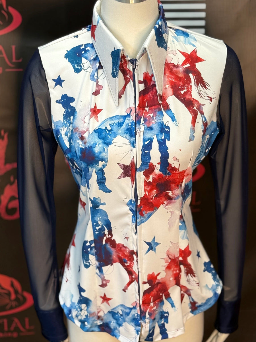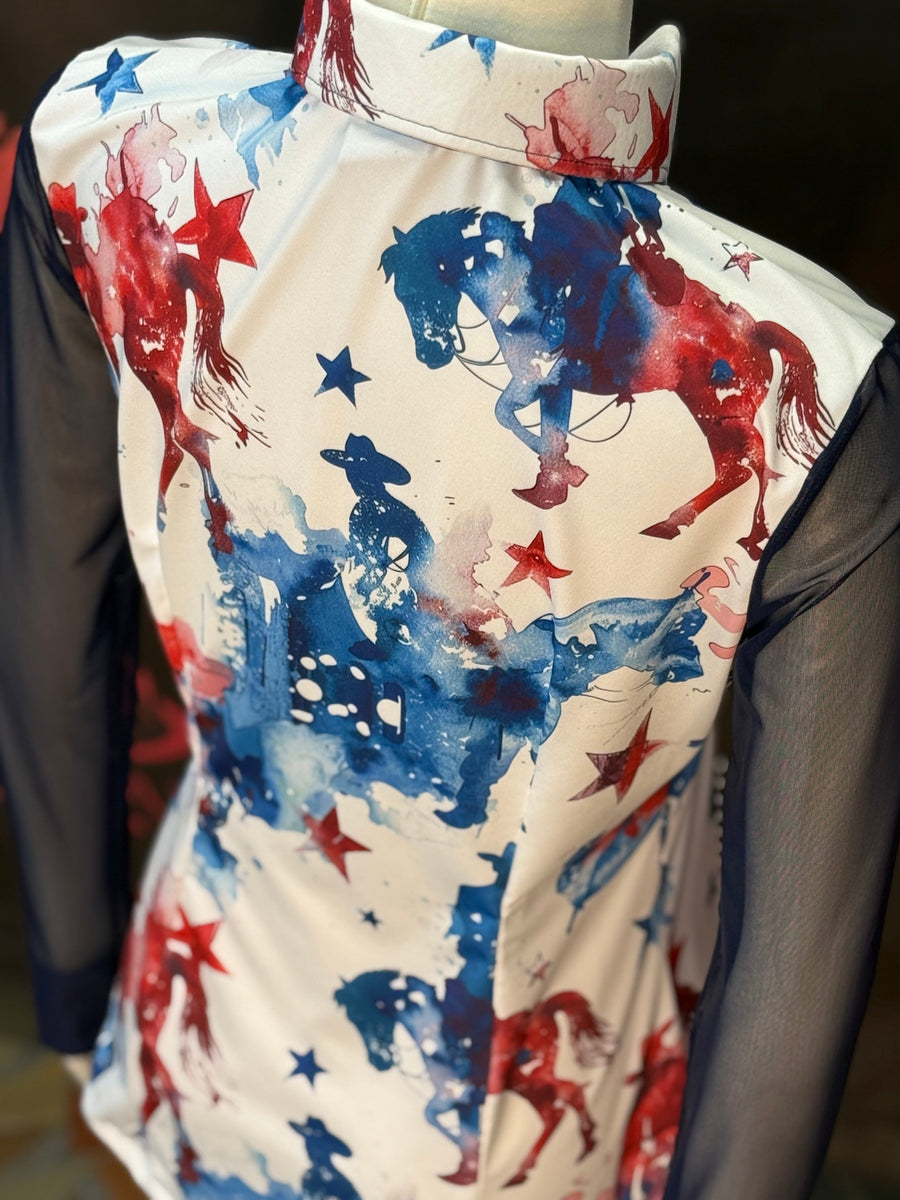 Saddle up in patriotic style with the Stars, Stripes & Spurs show shirt, featuring a bold watercolor western print that celebrates the American spirit. Galloping horses, classic cowboy silhouettes, and red, white, and blue accents come together in this statement-making piece—perfect for 4th of July shows or any time you want your love for country and western flair to shine. Made with Sundial’s signature attention to fit and detail, this shirt pairs striking visual appeal with premium comfort in and out of the ring. Ready to ship in size Medium with the Classic collar, paired here with a navy stretch mesh sleeve with a little sheen, as well as a navy cuff accent.