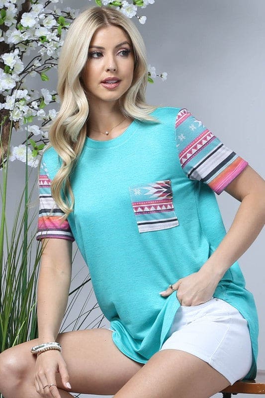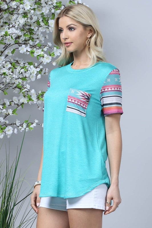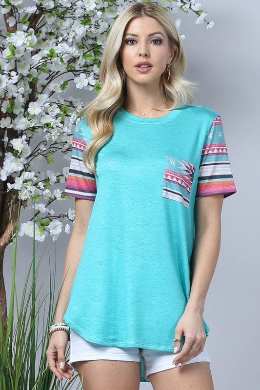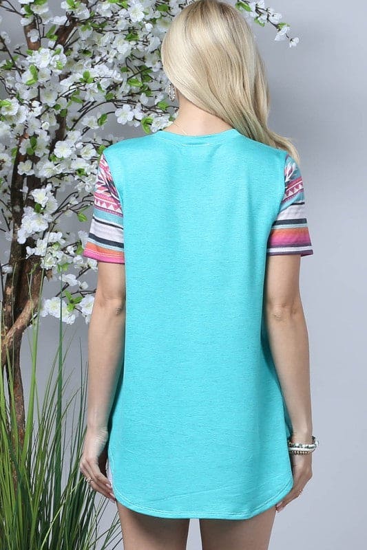 This flowy, lightweight fabric is a bright turquoise color with a cute serape accent on the sleeves and accent front pocket. This style runs loose fitting and long. Made in the USA and limited quantity so get yours before your size sells out...