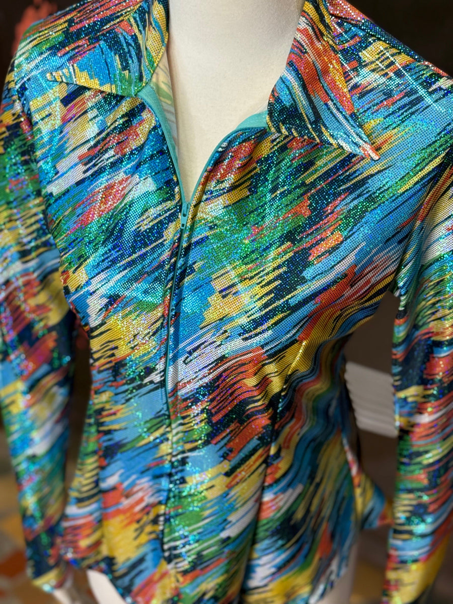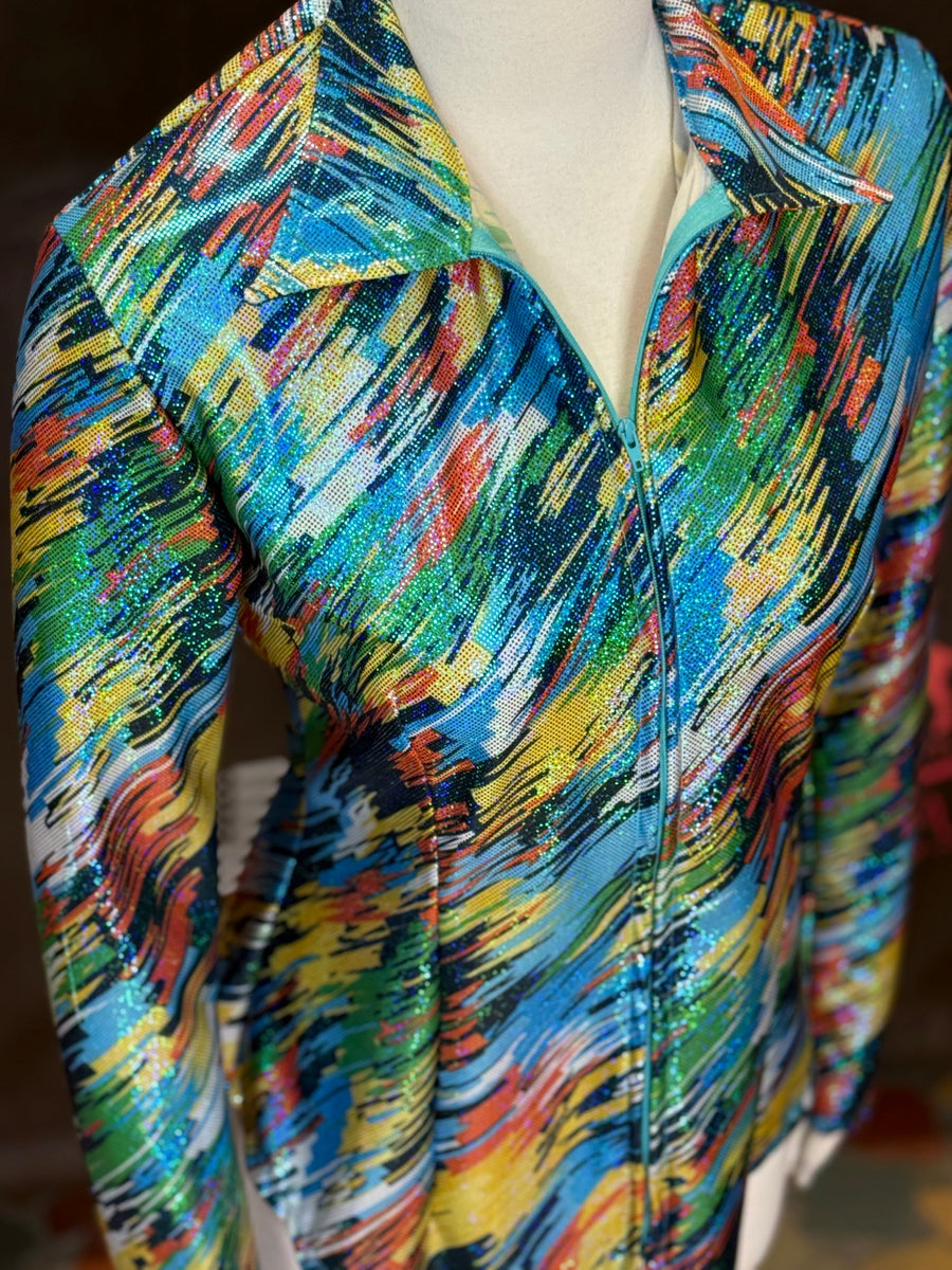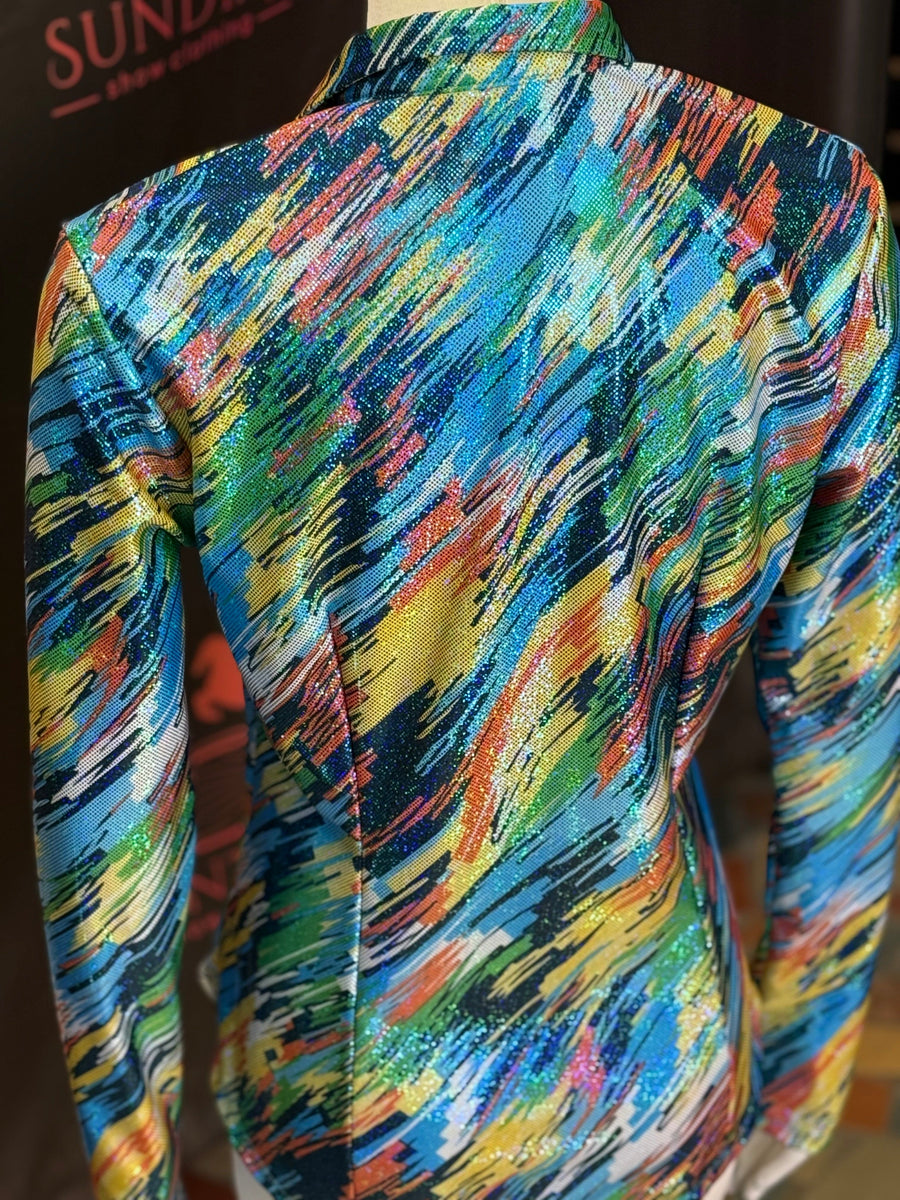 This gorgeous sparkle material features a sunset gradient of yellow, orange, black, white, green and blue hues. Made from lux performance stretch fabric to keep you comfortable and stylish.