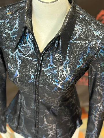 Our trendy split design styles offer a unique look from different angles! This oilslick fabric pairs perfectly with the Illusion Leopard fabric in Purple. Our made-for-you prints are made from lux performance fabric to keep you comfortable, cool, and dry. Ready to ship in our Classic collar style.