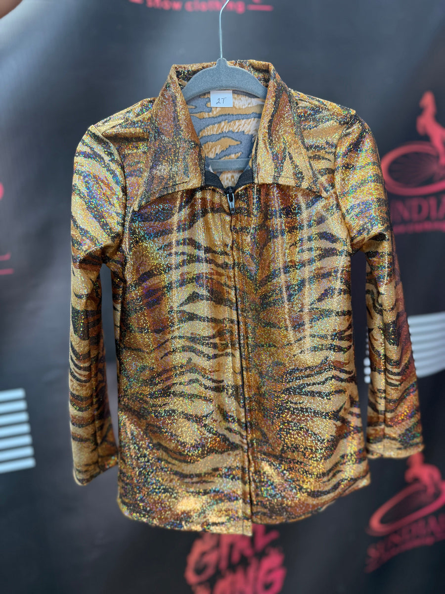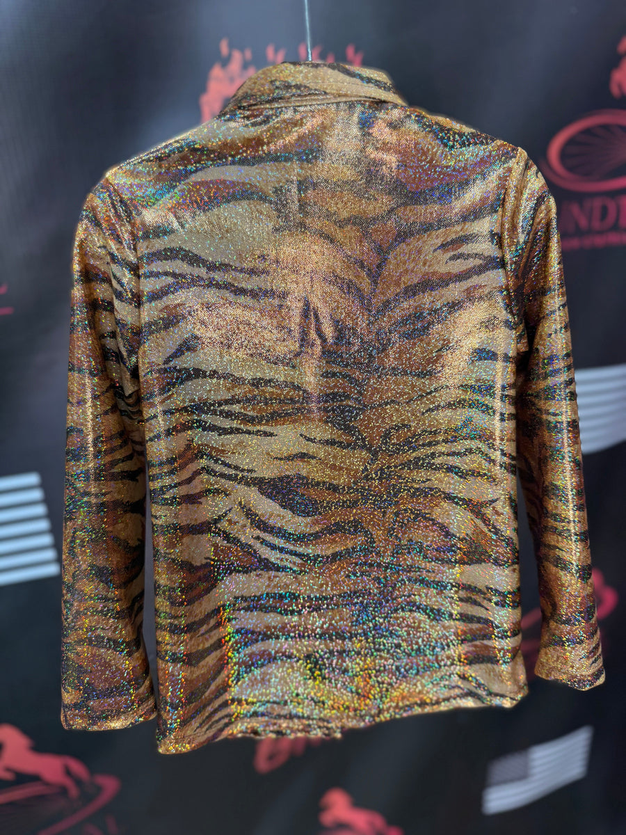 This holographic tiger stripe we call “Safari” is a standout with both gold shimmer and rainbow prism effects. Made from lux performance stretch fabric to keep you comfortable and stylish! In stock and ready to ship in size youth 2/3T with the relaxed collar style.